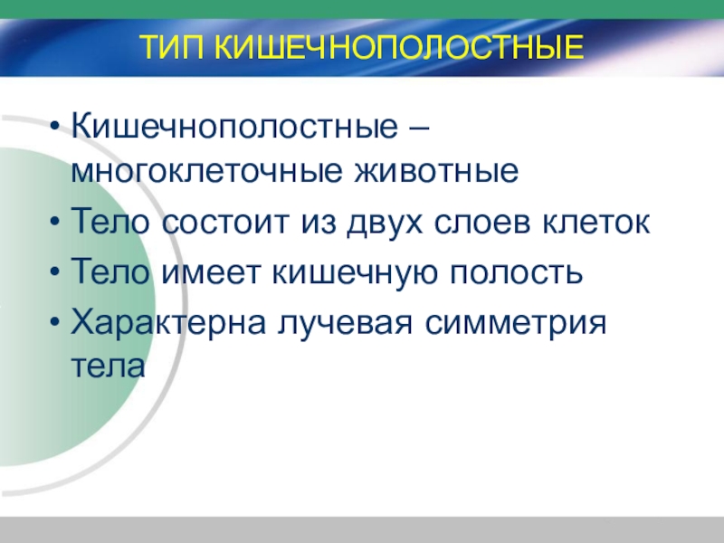ТИП КИШЕЧНОПОЛОСТНЫЕКишечнополостные – многоклеточные животныеТело состоит из двух слоев клетокТело имеет кишечную полостьХарактерна лучевая симметрия тела