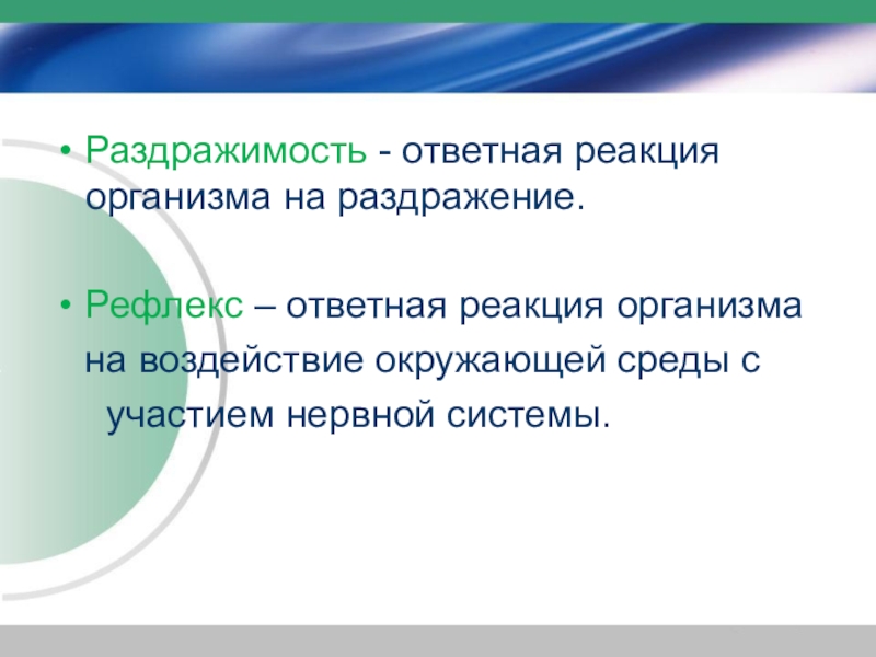 Слайд 10Раздражимость - ответная реакция организма на раздражение.