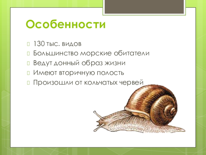 Особенности130 тыс. видовБольшинство морские обитателиВедут донный образ жизниИмеют вторичную полостьПроизошли от кольчатых червей