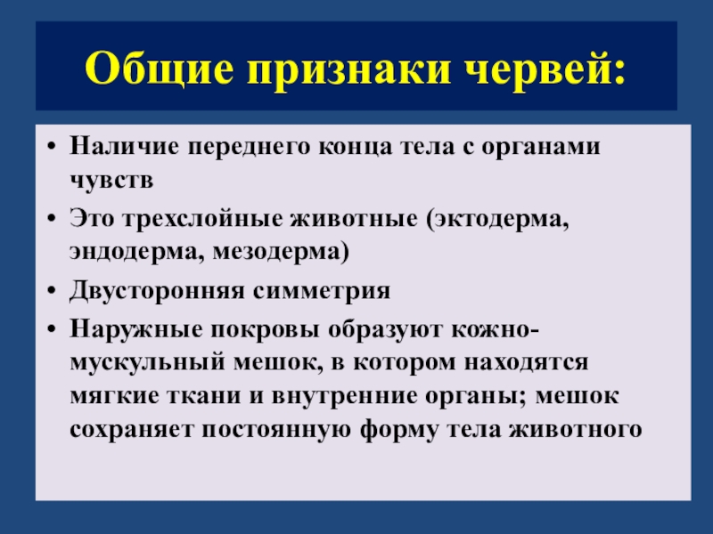 Общие признаки червей:Наличие переднего конца тела с органами чувствЭто трехслойные животные (эктодерма, эндодерма, мезодерма)Двусторонняя симметрияНаружные покровы образуют