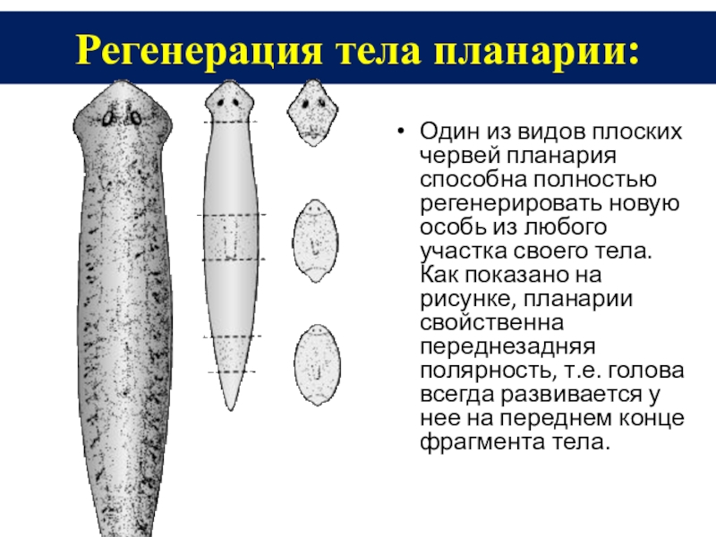 Регенерация тела планарии:Один из видов плоских червей планария способна полностью регенерировать новую особь из любого участка своего