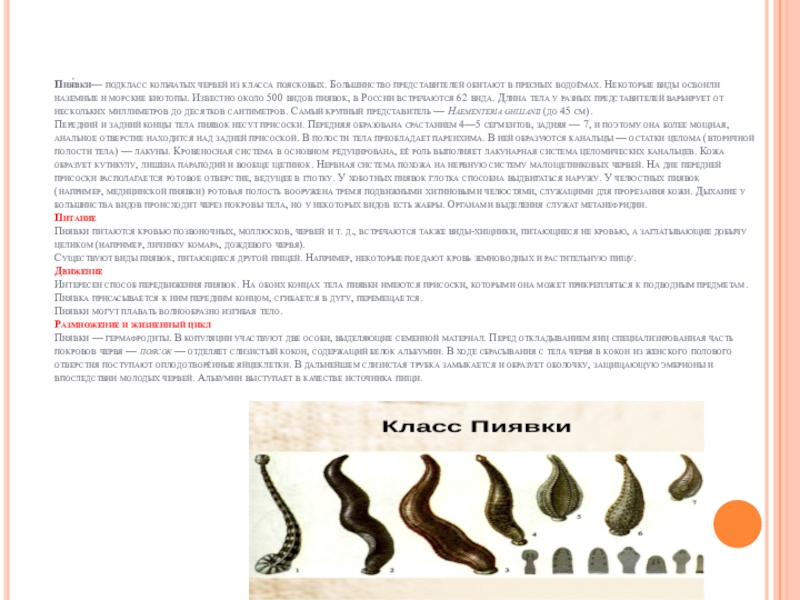 Слайд 9Пия́вки— подкласс кольчатых червей из класса поясковых. Большинство представителей обитают в пресных водоёмах. Некоторые