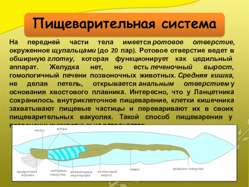 отверстие ведет в обширную глотку, которая функционирует как цедильный аппарат. Желудка нет, но есть печеночный вырост, гомологичный печени позвоночных животных. Средняя кишка, не делая петель, открывается анальным отверстием у основания хвостового плавника. Интересно, что у Ланцетника сохранилось внутриклеточное пищеварение, клетки кишечника захватывают пищевые частицы и переваривают их в своих пищеварительных вакуолях. Такой способ пищеварения у позвоночных животных не встречается.