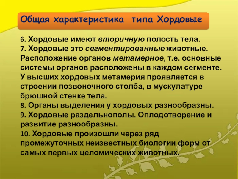 10. Хордовые произошли через ряд промежуточных неизвестных биологии форм от самых первых целомических животных.