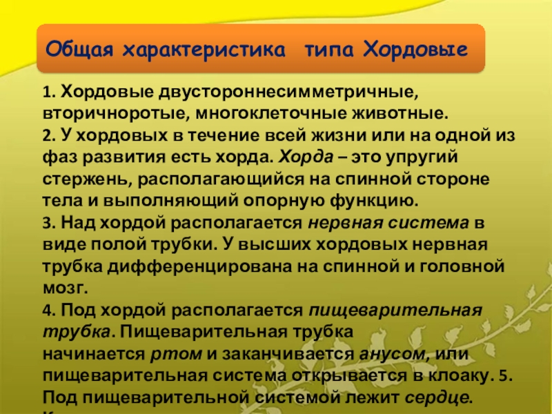 в течение всей жизни или на одной из фаз развития есть хорда. Хорда – это упругий стержень, располагающийся на спинной стороне тела и выполняющий опорную функцию.