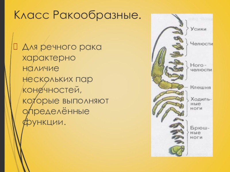 Класс Ракообразные.Для речного рака характерно наличие нескольких пар конечностей, которые выполняют определённые функции.