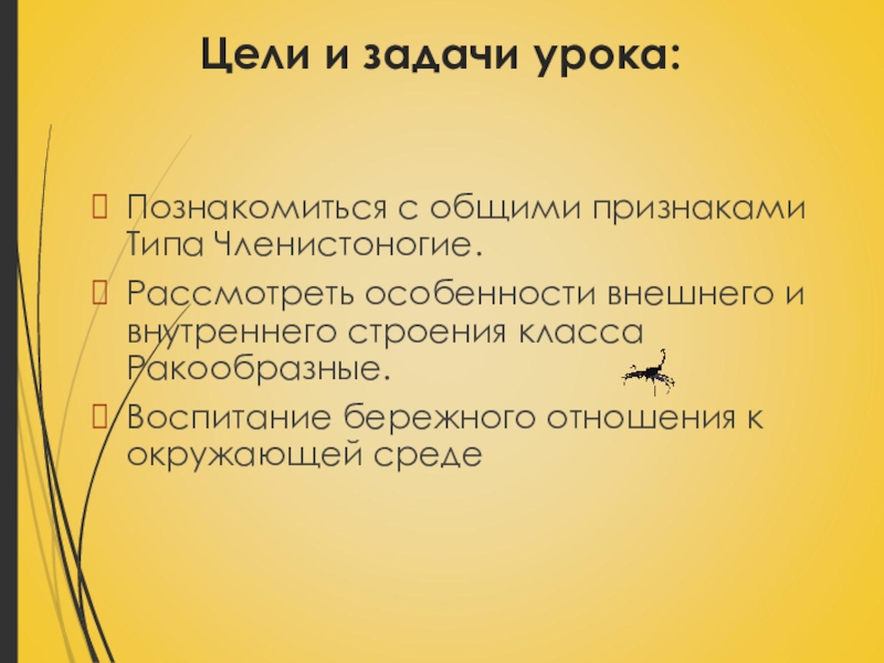 Цели и задачи урока:Познакомиться с общими признаками Типа Членистоногие.Рассмотреть особенности внешнего и внутреннего строения класса Ракообразные.Воспитание бережного
