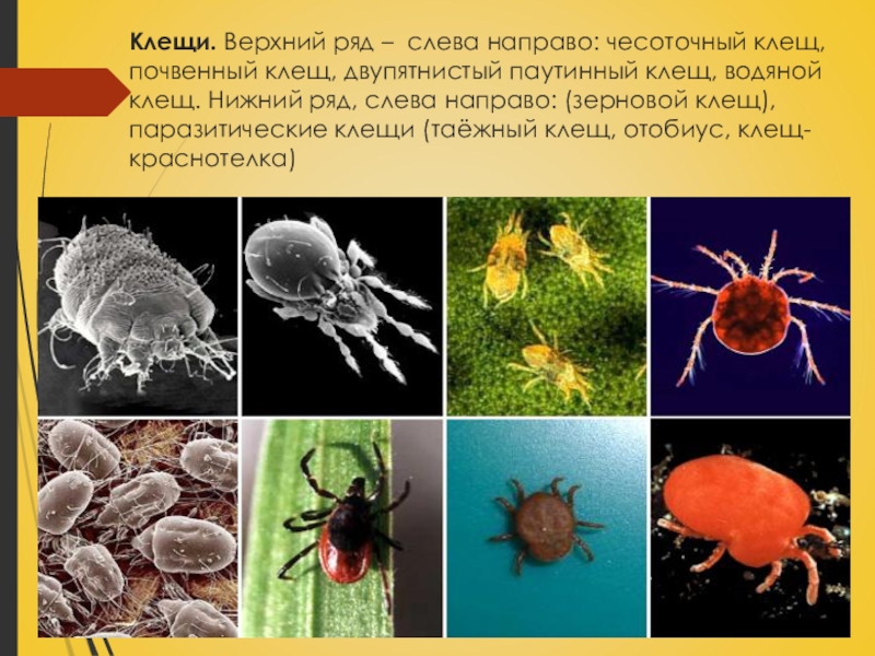 Слайд 10Клещи. Верхний ряд – слева направо: чесоточный клещ, почвенный клещ, двупятнистый