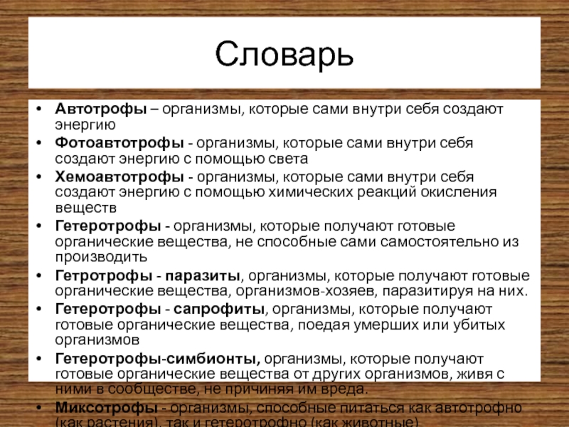 Слайд 6Автотрофы – организмы, которые сами внутри себя создают энергию