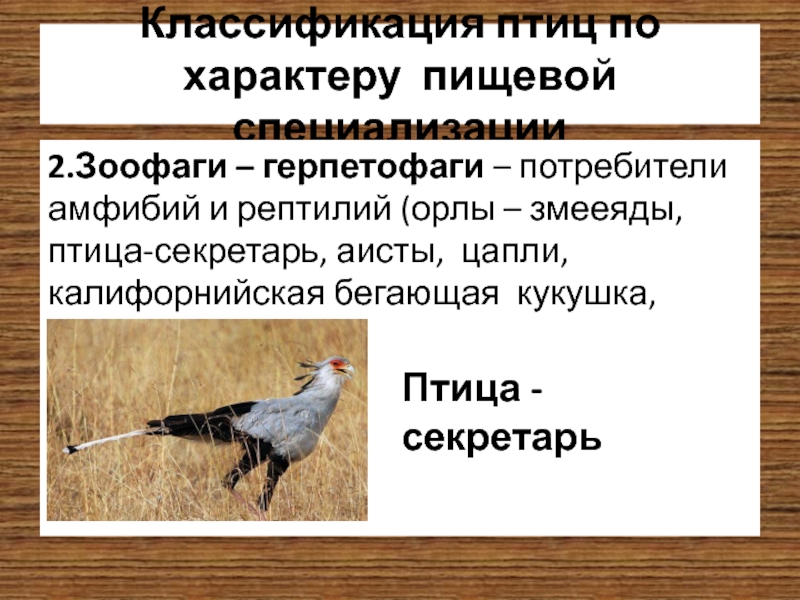 и рептилий (орлы – змееяды, птица-секретарь, аисты, цапли, калифорнийская бегающая кукушка, кариама)