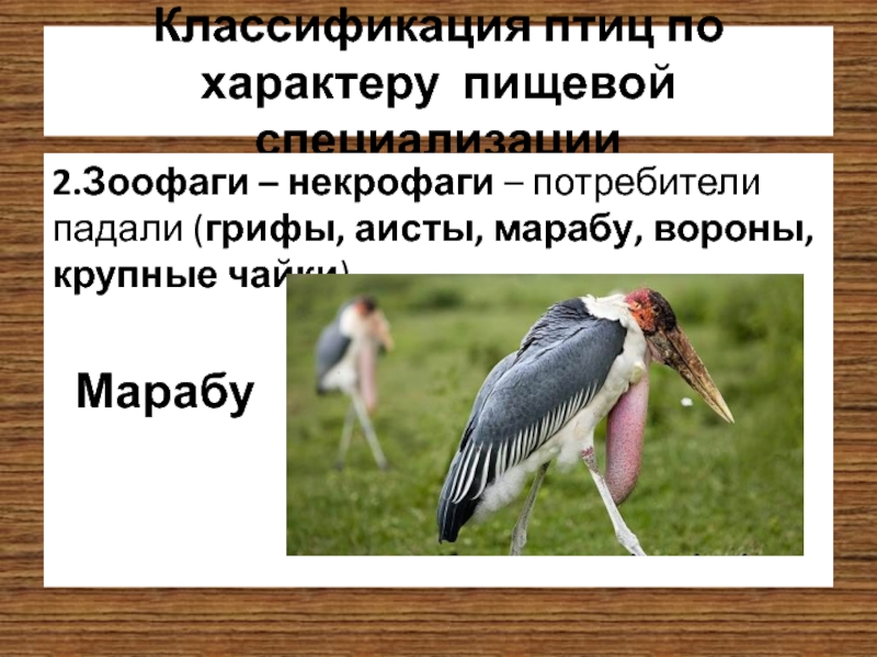 (грифы, аисты, марабу, вороны, крупные чайки)