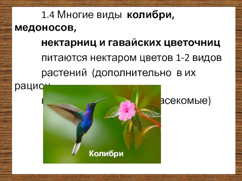 Слайд 19 1.4 Многие виды колибри, медоносов,