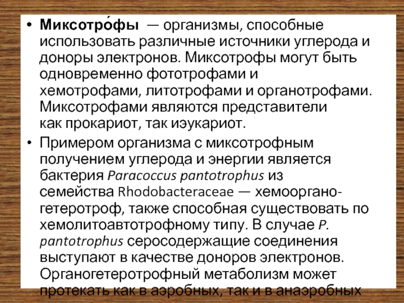 Слайд 5Миксотро́фы — организмы, способные использовать различные источники углерода и доноры электронов. Миксотрофы могут быть