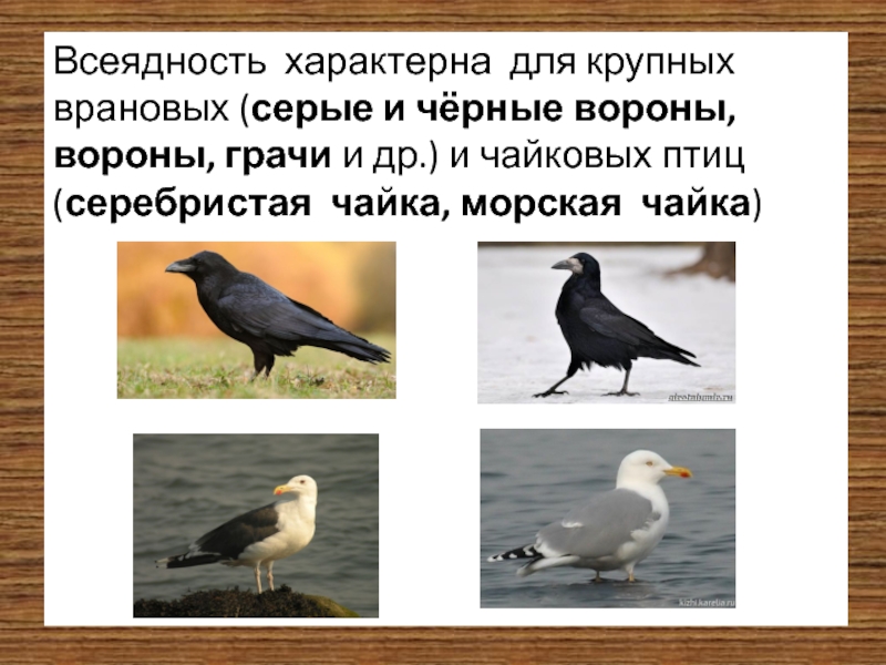 Слайд 22Всеядность характерна для крупных врановых (серые и чёрные вороны, вороны, грачи