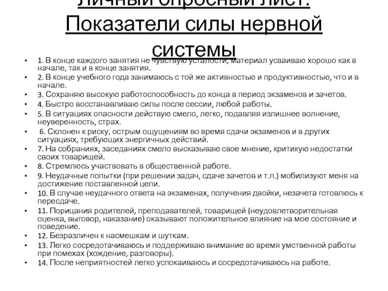 Слайд 4Личный опросный лист. Показатели силы нервной системы