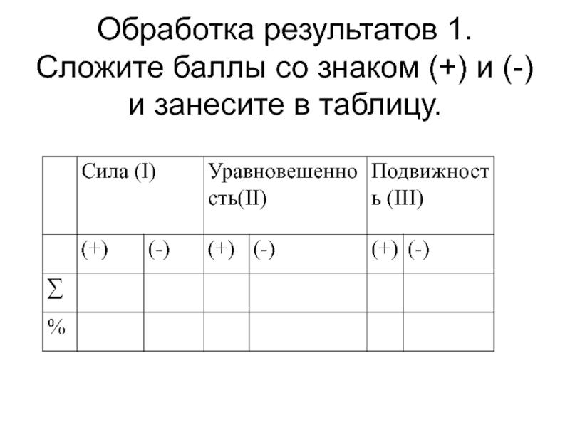 Слайд 7Обработка результатов 1. Сложите баллы со знаком (+) и (-) и