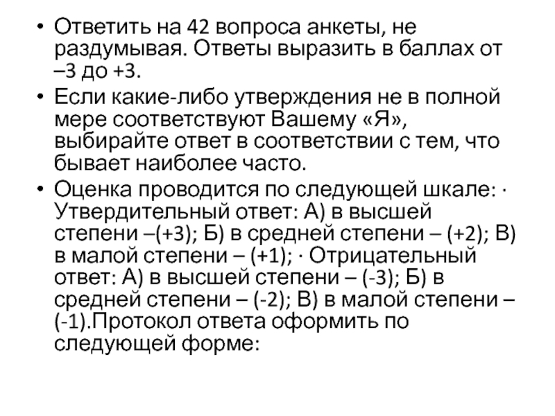 Слайд 3Ответить на 42 вопроса анкеты, не раздумывая. Ответы выразить в баллах