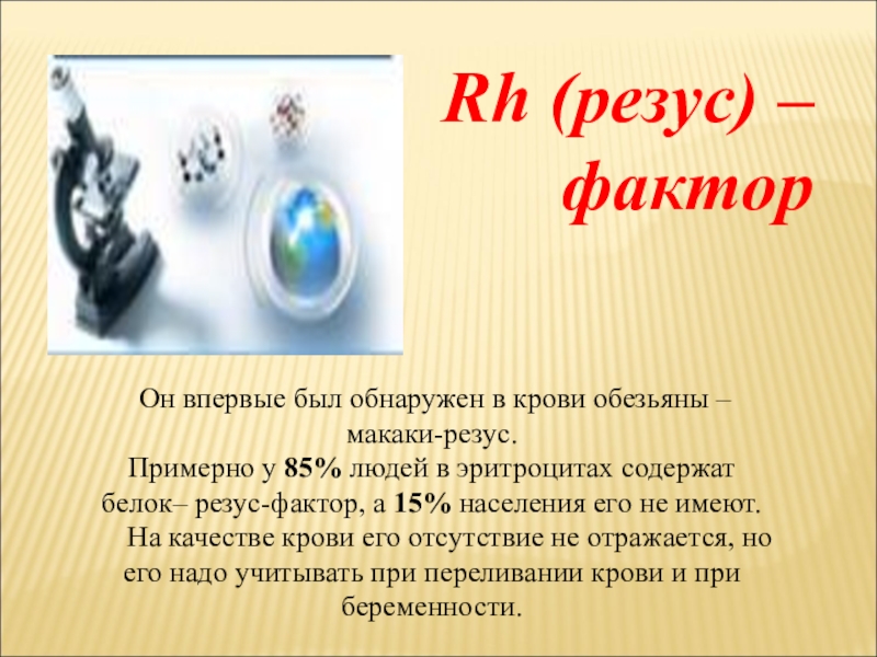 Примерно у 85% людей в эритроцитах содержат белок– резус-фактор, а 15% населения его не имеют.