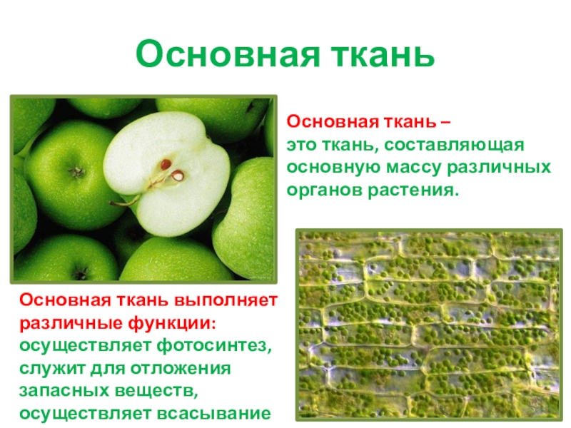 Основная ткань выполняет различные функции: осуществляет фотосинтез, служит для отложения запасных веществ, осуществляет всасывание воды.