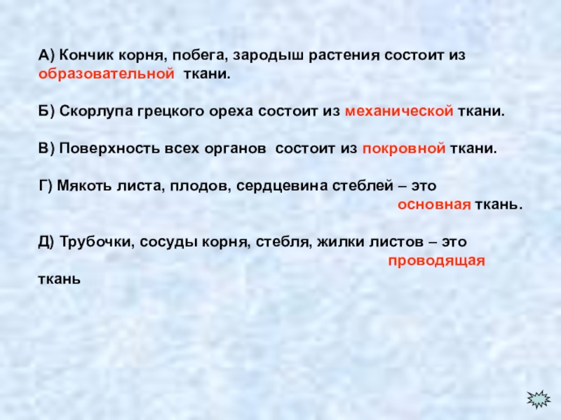 А) Кончик корня, побега, зародыш растения состоит из образовательной ткани.Б) Скорлупа грецкого ореха состоит из механической ткани.В)