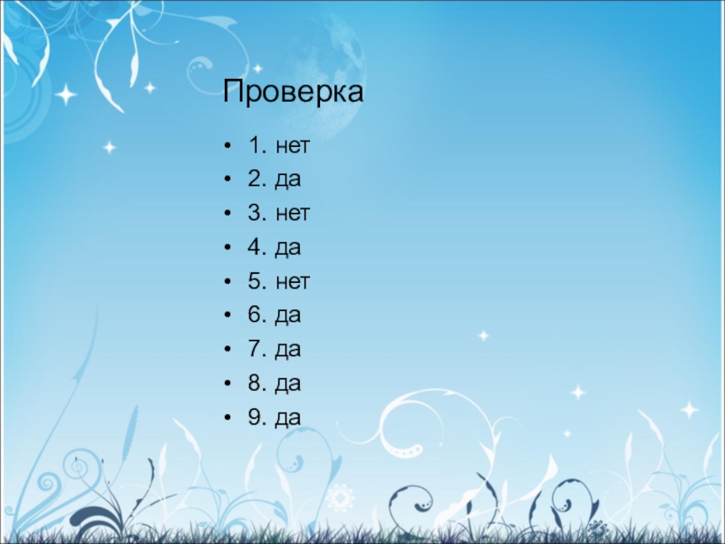 Проверка1. нет2. да3. нет4. да5. нет           6.