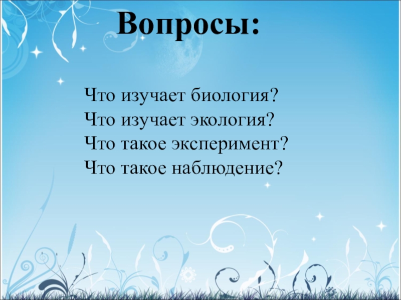 Слайд 3Что изучает биология? Что изучает экология? Что такое эксперимент? Что такое наблюдение?
