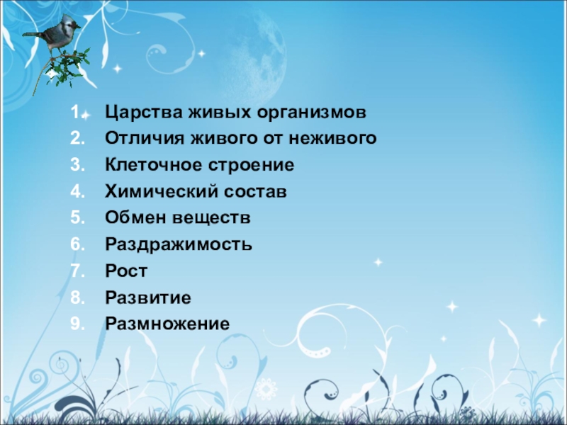 Царства живых организмовОтличия живого от неживогоКлеточное строениеХимический составОбмен веществРаздражимость РостРазвитиеРазмножение
