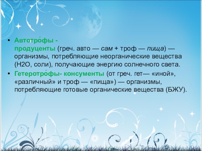 Автотро́фы - продуценты (греч. авто — сам + троф — пища) — организмы, потребляющие неорганические вещества (Н2О, соли), получающие энергию солнечного света.  Гетеротро́фы- консументы (от греч. гет—