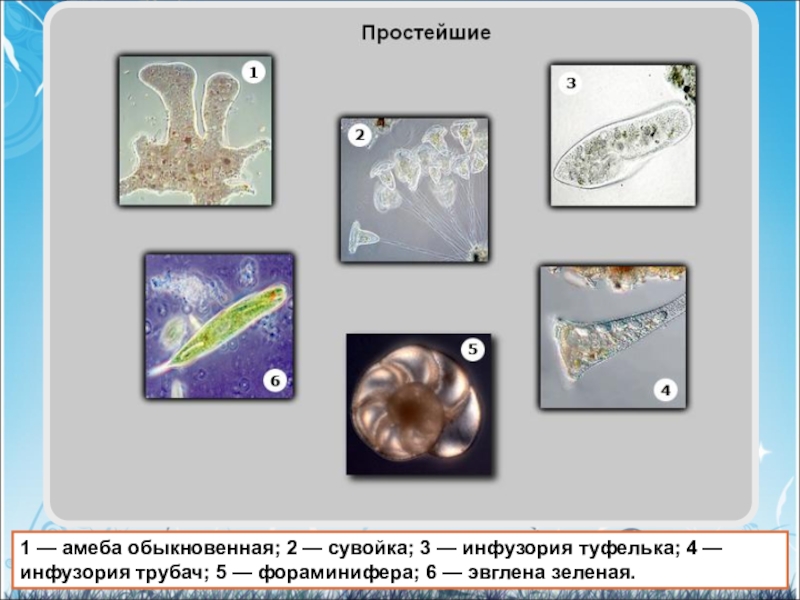 4 — инфузория трубач; 5 — фораминифера; 6 — эвглена зеленая.