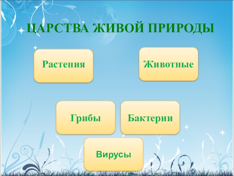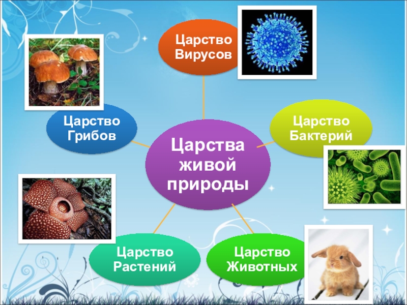 Царства живой природыЦарство ВирусовЦарство БактерийЦарство ЖивотныхЦарство РастенийЦарство Грибов