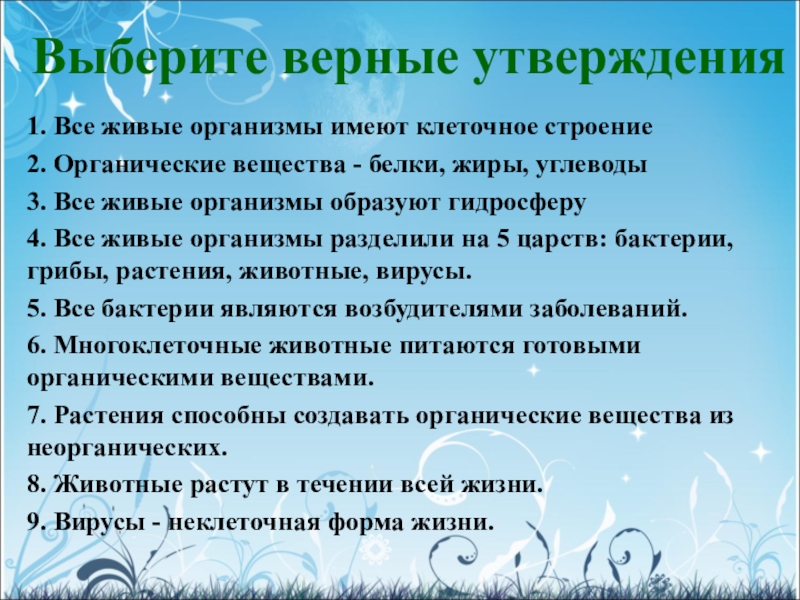 Выберите верные утверждения1. Все живые организмы имеют клеточное строение2. Органические вещества - белки, жиры, углеводы3. Все живые