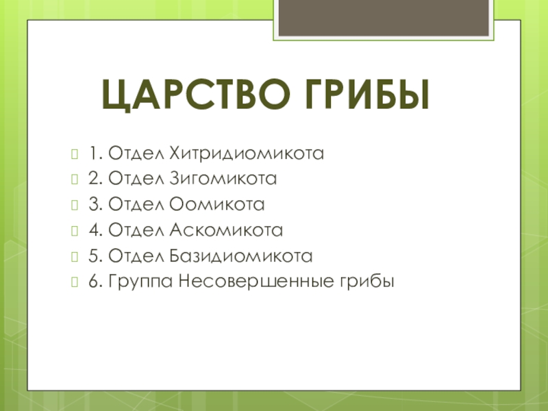 1. Отдел Хитридиомикота2. Отдел Зигомикота3. Отдел Оомикота4. Отдел Аскомикота5. Отдел Базидиомикота6. Группа Несовершенные грибыЦарство грибы
