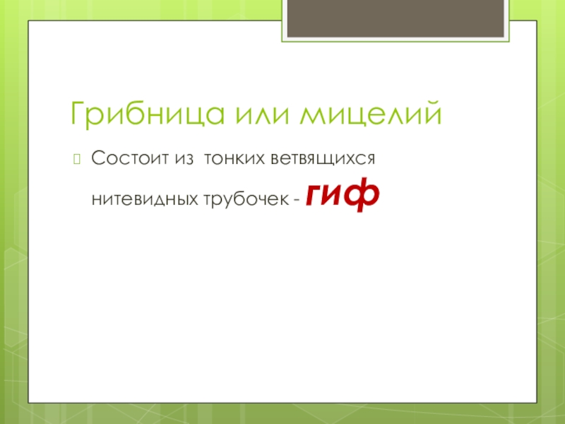 Грибница или мицелийСостоит из тонких ветвящихся нитевидных трубочек - гиф