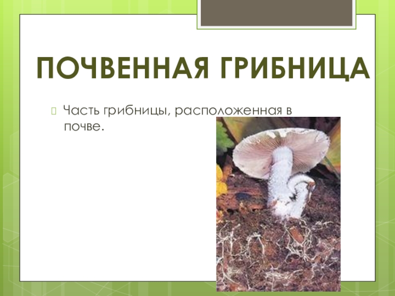 Часть грибницы, расположенная в почве.Почвенная грибница