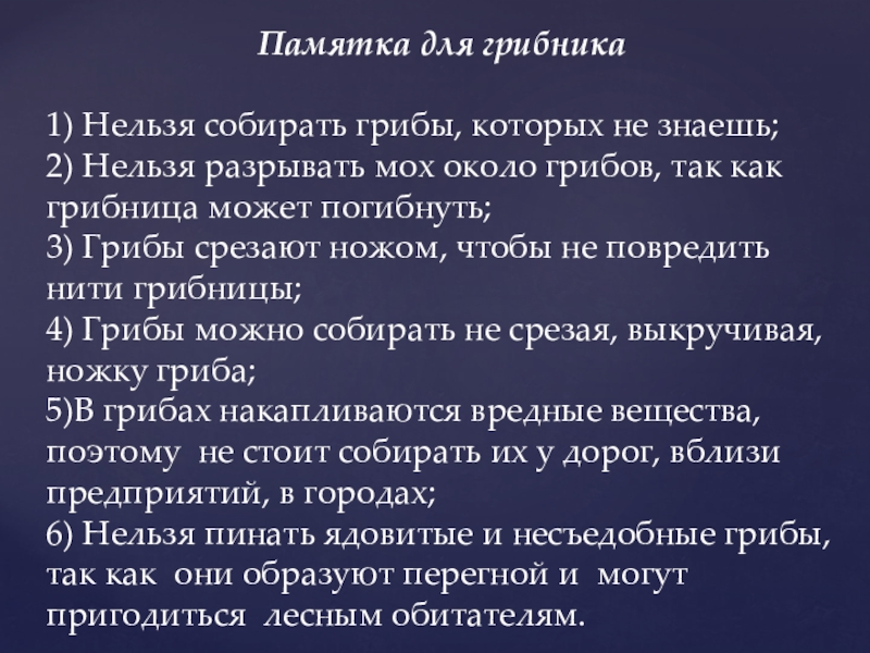 Памятка для грибника1) Нельзя собирать грибы, которых не знаешь; 2) Нельзя разрывать мох около грибов, так как