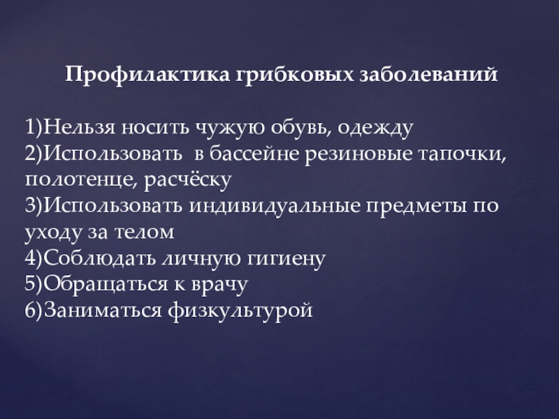 Профилактика грибковых заболеваний1)Нельзя носить чужую обувь, одежду2)Использовать в бассейне резиновые тапочки, полотенце, расчёску3)Использовать индивидуальные предметы по уходу