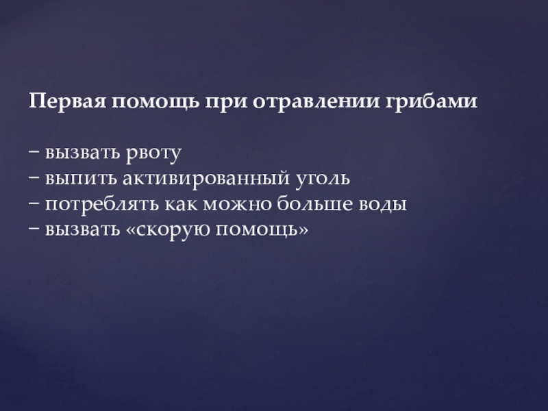 Первая помощь при отравлении грибами  вызвать рвоту  выпить активированный уголь  потреблять как можно больше