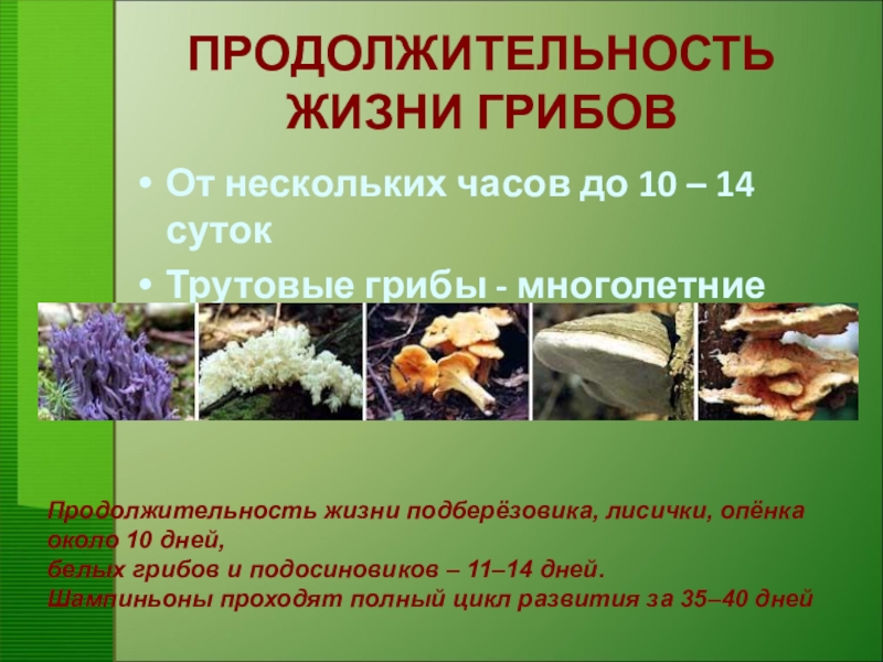 Продолжительность жизни подберёзовика, лисички, опёнка около 10 дней,