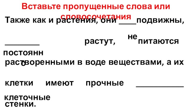 Также как и растения, они ____подвижны, ________ растут, питаются растворенными в воде веществами, а их клетки имеют прочные ___________ стенки.