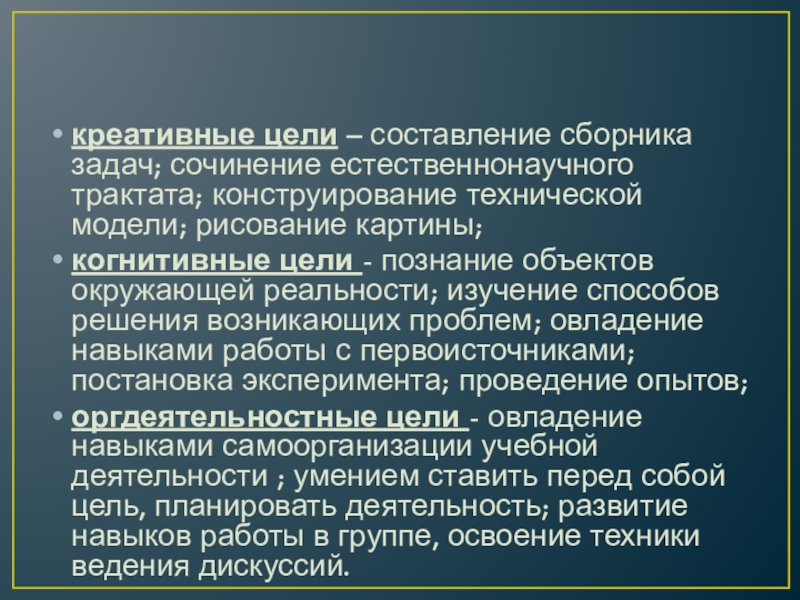 Слайд 15креативные цели – составление сборника задач; сочинение естественнонаучного трактата; конструирование технической