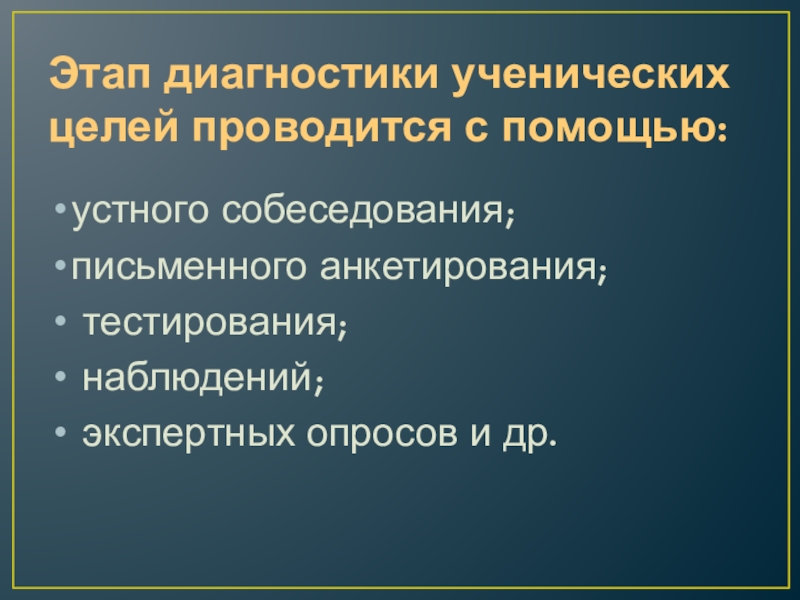 Слайд 12Этап диагностики ученических целей проводится с помощью: