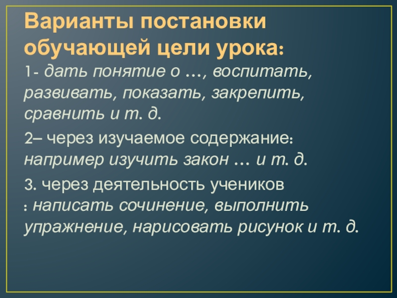 Слайд 17Варианты постановки обучающей цели урока: