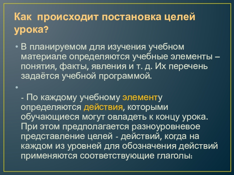 - По каждому учебному элементу определяются действия, которыми обучающиеся могут овладеть к концу урока. При этом предполагается разноуровневое представление целей - действий, когда на каждом из уровней для обозначения действий применяются соответствующие глаголы: