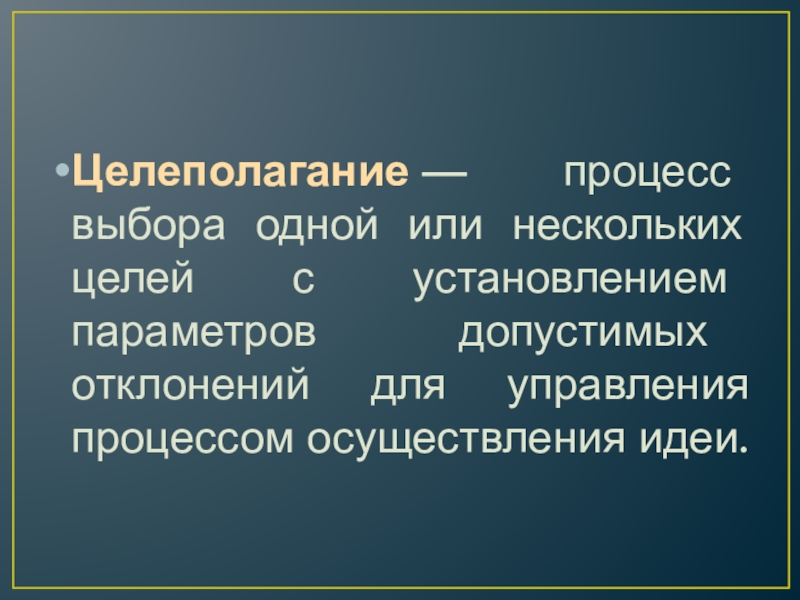 Слайд 25Целеполагание — процесс выбора одной или нескольких целей с установлением параметров допустимых