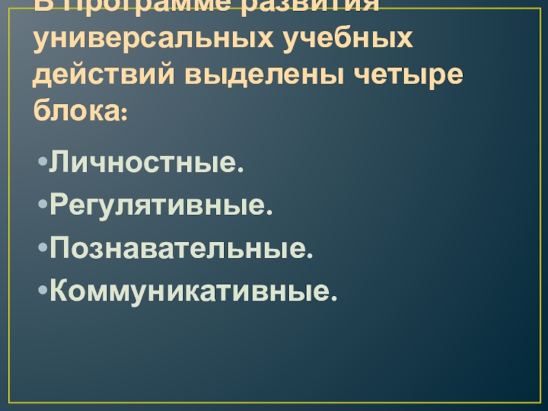 Слайд 3В Программе развития универсальных учебных действий выделены четыре блока:
