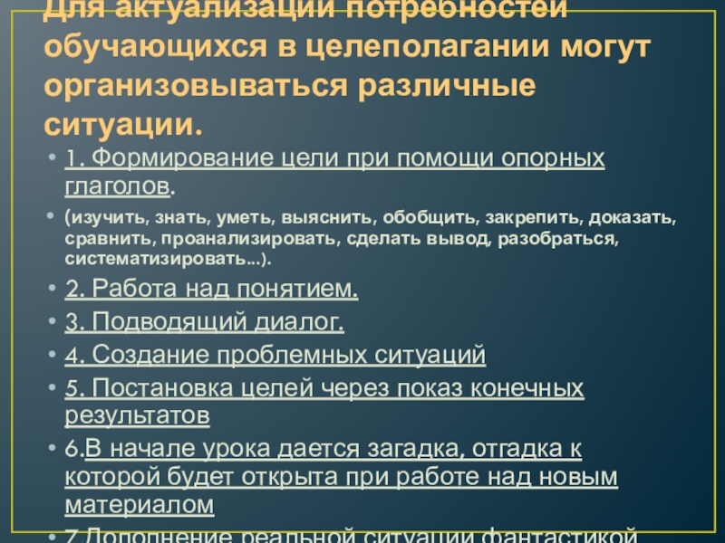 Слайд 23Для актуализации потребностей обучающихся в целеполагании могут организовываться различные ситуации.