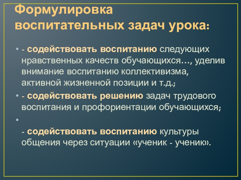 Слайд 22Формулировка воспитательных задач урока: