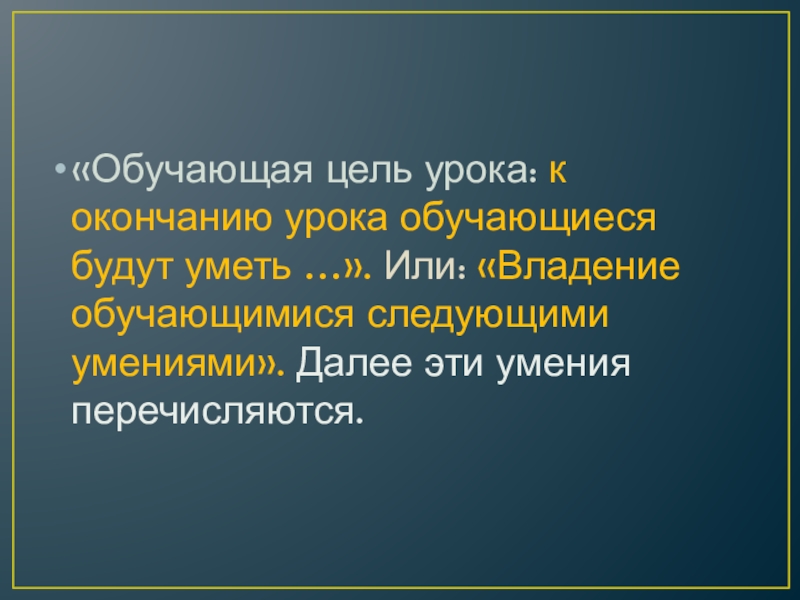 Слайд 20«Обучающая цель урока: к окончанию урока обучающиеся будут уметь …». Или:
