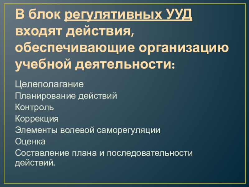 Слайд 5В блок регулятивных УУД входят действия, обеспечивающие организацию учебной деятельности:
