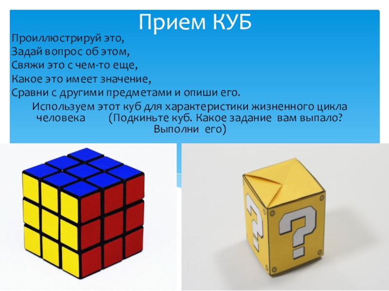 Прием КУБПроиллюстрируй это,Задай вопрос об этом,Свяжи это с чем-то еще,Какое это имеет значение,Сравни с другими предметами и